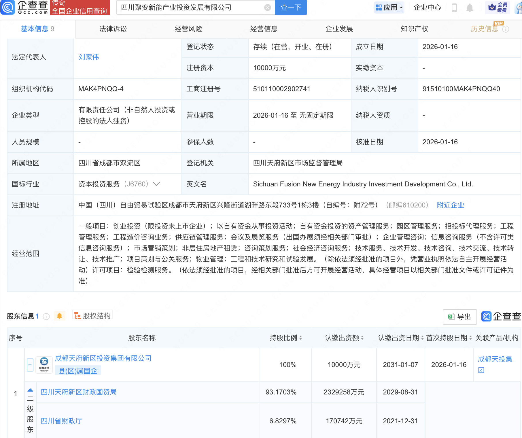 近日,四川聚变新能产业投资发展有限公司成立速牛配资,注册资本1亿元,经营范围包含:创业投资(限投资未上市企业);以自有资金从事投资活动;自有资金投资的资产管理服务等。企查查股权穿透显示,该公司由成都天府新区投资集团有限公司全资持股。